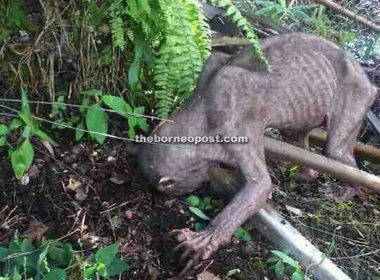 Trabalhadores da cidade de Sibu, na Indonésia, encontraram um animal bizarro em uma estrada próxima a uma plantação de palmeiras antes de entrarem em serviço.
