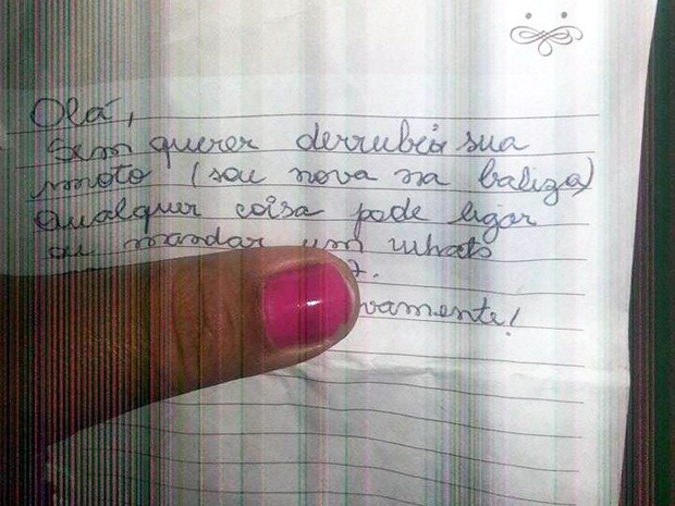 Uma moradora de Santos, no litoral paulista, encontrou um bilhete inusitado quando foi pegar sua motocicleta que estava estacionada em uma avenida do município. No recado, uma mulher assumia ser a responsável pelo acidente e informava que era “nova na baliza”. O número do celular para contato e a promessa de que o valor gasto no conserto seria reembolsado também constavam no papel.