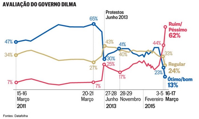 Pesquisa Datafolha divulgada nesta quarta-feira mostra que 62% dos brasileiros consideram a gestão da presidente Dilma Rousseff como ruim ou péssima. A impopularidade de Dilma subiu 18 pontos comparada ao levantamento anterior do instituto em fevereiro.