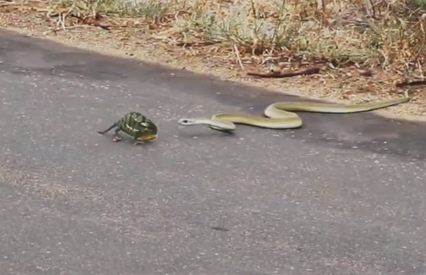 Uma cobra venenosa foi flagrada capturando um camaleão no Parque Nacional Kruger, na África do Sul. Um vídeo impressionante mostra a cobra, da espécie Dispholidus typus, atacando rapidamente o animal.