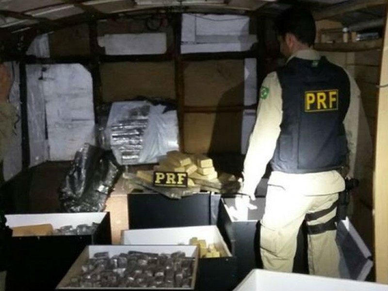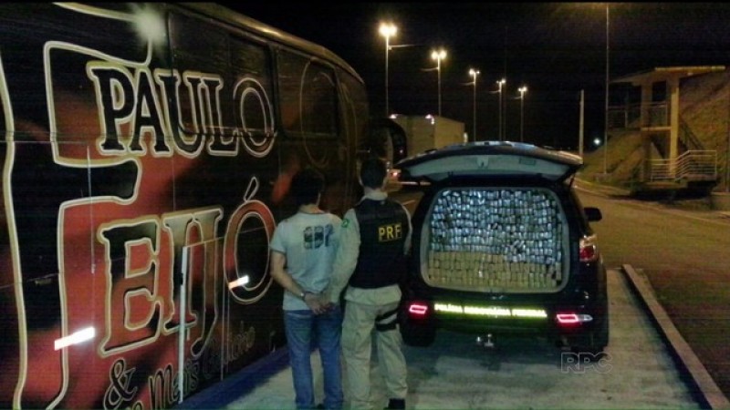 A Polícia Rodoviária Federal (PRF) apreendeu 740,4 kg de maconha na madrugada desta segunda-feira (22) na BR-376, em São José dos Pinhais, na Região Metropolitana de Curitiba. De acordo com a PRF, a droga estava dentro de um ônibus caracterizado com logomarca e fotos de um grupo de música tradicionalista gaúcha. Um casal foi preso.