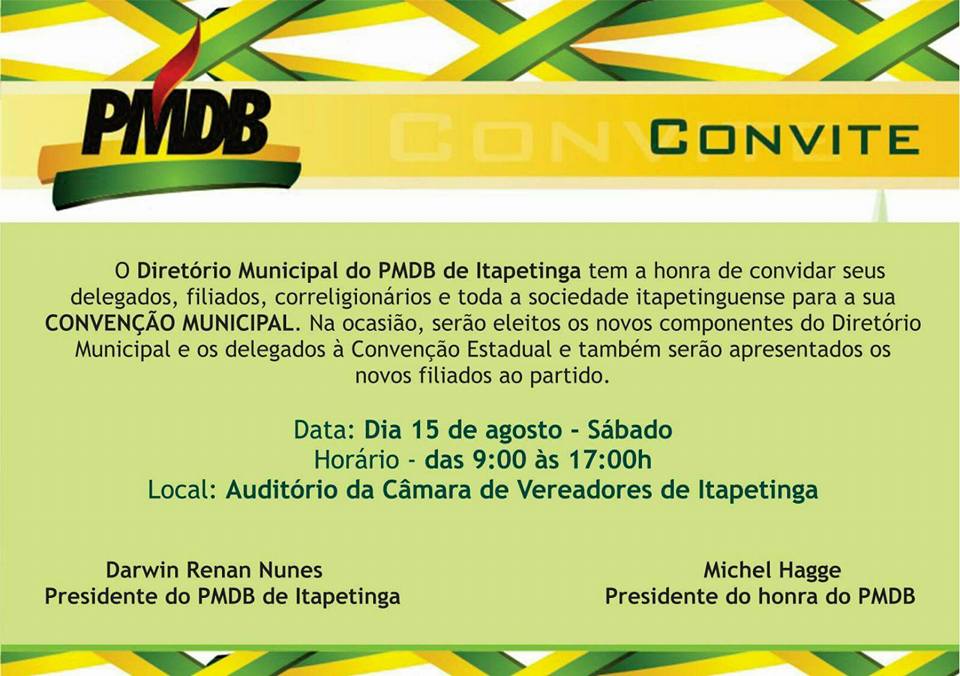 PMDB CONVIDA TODA A COMUNIDADE ITAPETINGUENSE PARA SUA CONVENÇÃO MUNICIPAL