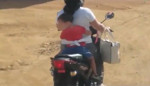 MULHER É FLAGRADA LEVANDO CRIANÇA AMARRADA E SEM CAPACETE NA GARUPA DE MOTO