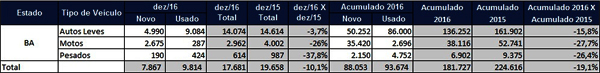 Em 2016, a Bahia foi líder nos financiamentos de veículos na região Nordeste, com 181.727 unidades vendidas a crédito, queda de 19,1% em relação a 2015. Automóveis leves representaram 75% do total financiado no ano, ao somarem 136.252 unidades negociadas. O resultado apresentou uma baixa de 15,8% na comparação com o ano anterior. O levantamento é da Unidade de Financiamentos da Cetip, que opera o maior banco de dados privado de informações sobre financiamentos de veículos do país, o Sistema Nacional de Gravames (SNG).