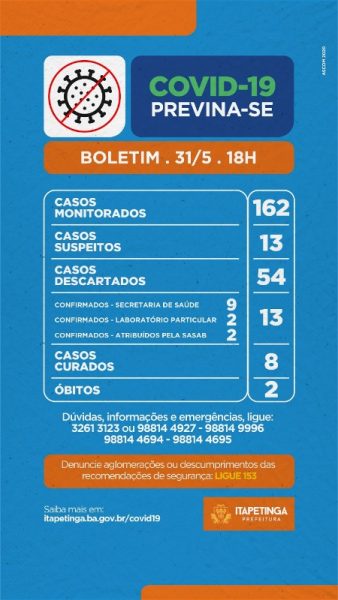 Itapetinga, segue, então, com 13 casos confirmados (2 deles não reconhecidos pela secretaria municipal), 54 casos descartados, 8 casos curados e 2 óbitos.
