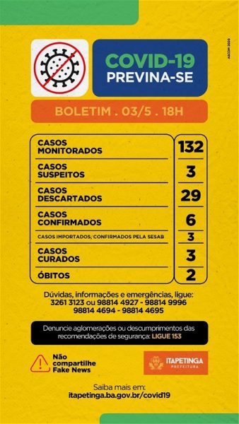 Assim, Itapetinga agora registra 6 casos confirmados e 28 descartados. A Sesab soma aos casos itapetinguenses, ainda, mais 3 casos que foram monitorados, testados e confirmados em outros municípios. No entanto, a Secretaria de Itapetinga não atesta resultado de exames que não foram feitos no município.