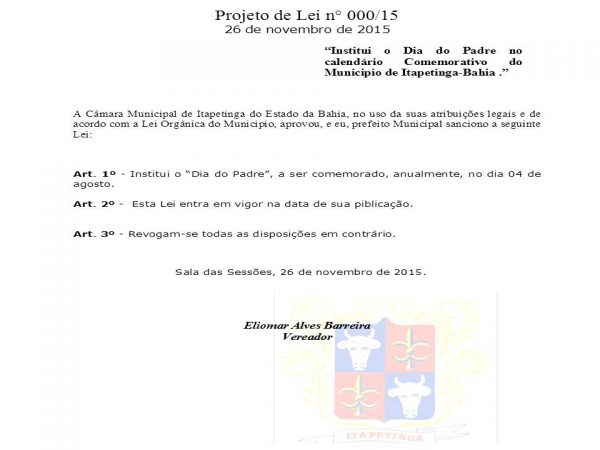 O ‘Dia do Padre’ está entre essa datas, que a partir da sanção do chefe do Poder Executivo, é comemorado no dia 04 de agosto de cada ano no município de Itapetinga, mês que se reverencia Nacionalmente a todos os Padres. A Lei [veja abaixo] visa comemorar com destaque o dia do sacerdócio católico, tendo em vista, os relevantes serviços prestados desde o descobrimento do Brasil, uma vez que esta nação, historicamente nasceu sobre o signo da fé católica.