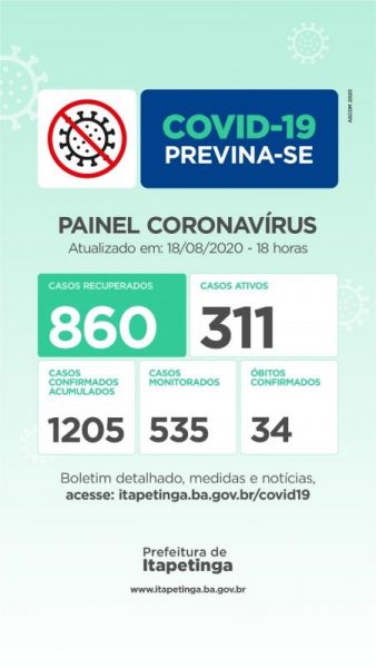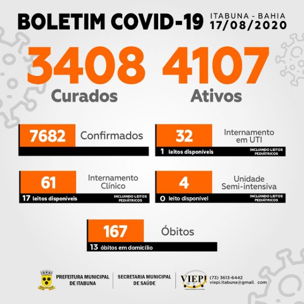 Os dados apontam ainda que 61 pacientes estão internados em leito clínico, sendo 32 em Unidade de Terapia Intensiva. Em contrapartida, 3.408 pessoas já foram curadas da doença. Itabuna é a terceira cidade da Bahia em número de casos confirmados, atrás apenas de Salvador e Feira de Santana.