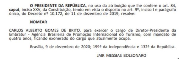 Para a vaga de Machado na Embratur foi nomeado Carlos Alberto Gomes de Brito.