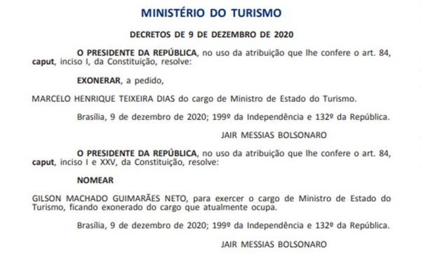 GILSON MACHADO É NOMEADO MINISTRO DO TURISMO; MARCELO ÁLVARO ANTÔNIO É EXONERADO