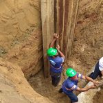 Por ser um local de grande profundidade e que exige todo um aparato de segurança, foi utilizada uma retroescavadeira e instalada uma grade de proteção para execução do serviço.