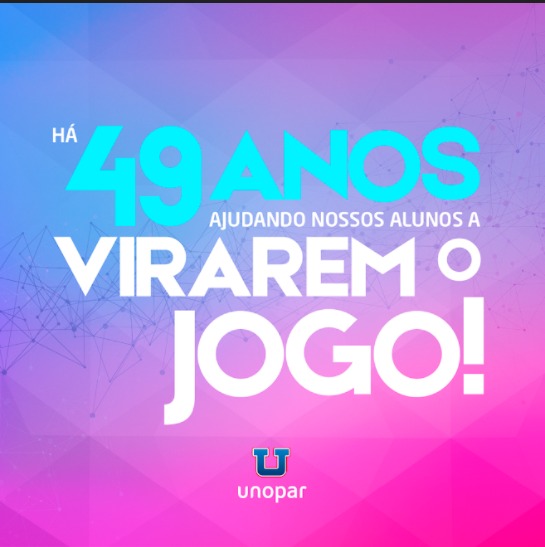 Desde a nossa fundação, somos referência em inovação e no desenvolvimento de tecnologias para que as pessoas pudessem estudar de qualquer lugar. Essa iniciativa pioneira nos permite estar presente em todos os cantos do país e ser reconhecidos como maior EAD do Brasil. Hoje, celebramos nosso aniversário de 49 anos e o nosso maior presente é ver nossos alunos virando o jogo de suas vidas. Venha fazer parte dessa história e vire o jogo com a Unopar.