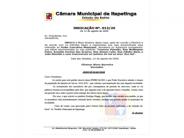 Em 2020/2021, o vereador Eliomar Alves Barreira (Tarugão), propôs através de Indicação na Câmara Municipal de Itapetinga, pavimentação de ruas. Agora chegou a vez do bairro QUINTAS DO SUL.