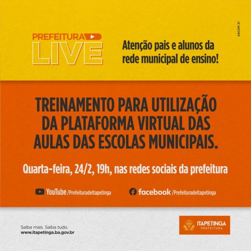 Atenção pais e alunos da rede municipal de ensino. Nesta quarta-feira, 24, às 19hs, a prefeitura de Itapetinga fará uma live de treinamento para utilização da plataforma virtual na qual serão ministradas as aulas a partir do próximo dia 01. Participem através do youtube da prefeitura de Itapetinga. É fundamental a participação de toda a comunidade escolar para seguirmos construindo uma cidade educadora.