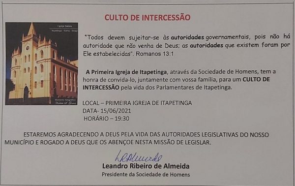 Acontecerá no próximo dia 15/06,  ( terça-feira ) um Culto de Intercessão pela vida dos Parlamentares de Itapetinga.