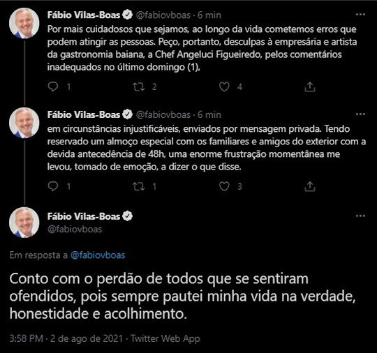 Nas redes sociais, o secretário de saúde admitiu ter xingado a chef e pediu desculpas. “Por mais cuidadosos que sejamos, ao longo da vida cometemos erros que podem atingir as pessoas. Peço, portanto, desculpas à empresária e artista da gastronomia baiana, a Chef Angeluci Figueiredo, pelos comentários inadequados no último domingo (1), em circunstâncias injustificáveis, enviados por mensagem privada”, disse Fábio Vilas-Boas.
