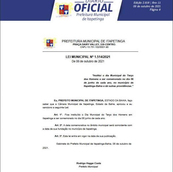 A Câmara Municipal de Itapetinga aprovou e o prefeito Rodrigo Hagge sancionou o projeto de lei de autoria do vereador Tarugão, que cria o Dia Municipal do Terço dos Homens de Itapetinga a ser comemorado em uma data que coincide com a fundação do movimento no município, 06 de julho de cada ano. A Lei Municipal 1.514/2021, que institui o Dia do Terço dos Homens foi sancionado em 08 de outubro pelo chefe do Executivo.