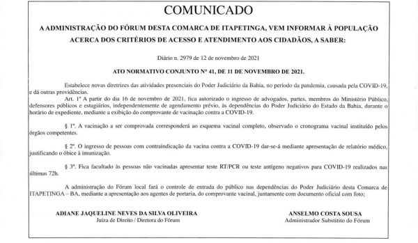 A administração do Fórum local fará o controle de entrada do público nas dependências do Poder Judiciário desta Comarca de ITAPETINGA — BA, mediante a apresentação aos agentes de portaria, do comprovante vacinal, juntamente com documento oficial com foto;