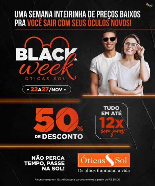 BLACK WEEK ÓTICAS SOL DE 22 A 27 DE NOVEMBRO. LOUCURA TOTAL 50% DE DESCONTO EM ATÉ 12X SEM JUROS