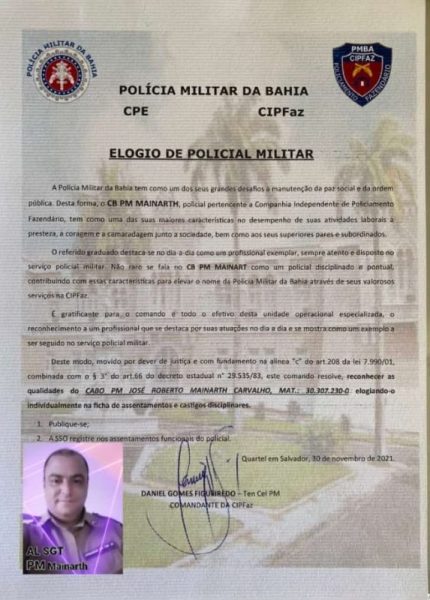 Foi elogiando recentemente recebeu um elogio da instituição Polícia Militar-Ba entre tantas outras.
