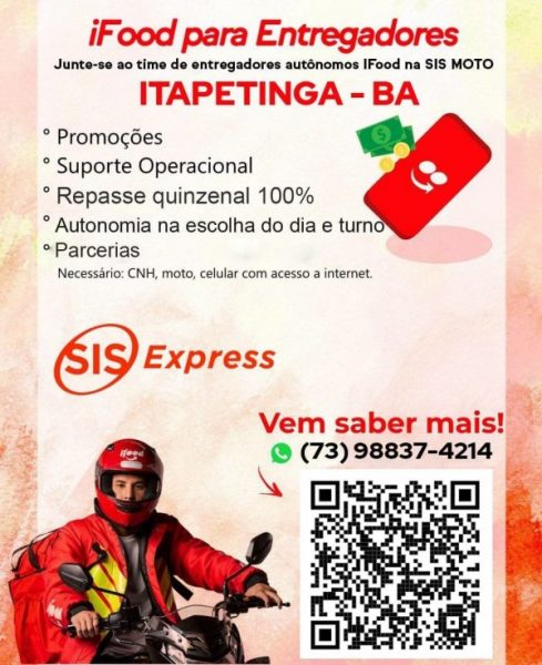 A Empresa SIS Express Operadora Logística chegou a Itapetinga, e vai gerar 15 vagas para entregadores de Ifood de ambos os sexos, a partir de 18 anos para fazer entregas com bicicleta ou motocicleta.