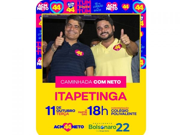 Em plena campanha eleitoral para o segundo turno, o candidato ao governo da Bahia, ACM Neto (União Brasil), visitará o município de Itapetinga nessa terça-feira, amanhã (11/10).