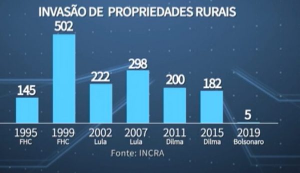 Ainda não citamos os números de invasões de terra, que lamentávelmente são incentivadas por um determinado candidato. A segurança do homem do campo é marca do governo Bolsonaro, saímos de quase 300 invasões durante o governo Lula para impressionantes 05 invasões em 2019.