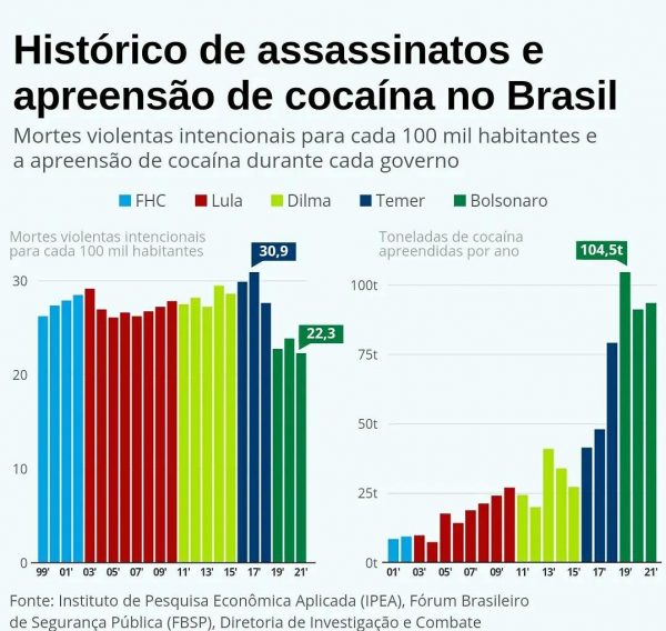 A violência letal no Brasil atingiu o recorde histórico em 2017, quando mais de 64 mil pessoas foram assassinadas e a taxa de mortalidade chegou a 30,9 por 100 mil habitantes. Desde 2018, com o início do Governo Bolsonaro, no entanto, o país tem reduzido anualmente a taxa de mortes violentas intencionais, chegando a 22,3 em 2021, em números totais foram 47.503 pessoas assassinadas.