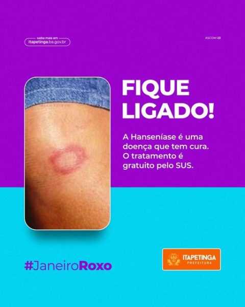 Janeiro é o mês de conscientização sobre os cuidados e a prevenção da hanseníase. Durante a campanha do Janeiro Roxo, a Secretaria da Saúde de Itapetinga reforça a necessidade de atenção, mobilização e combate à doença. As ações do Janeiro Roxo também visam lembrar da importância do diagnóstico precoce e do tratamento que é ofertado de forma gratuita pelo Sistema Único de Saúde (SUS), além da luta contra o preconceito.