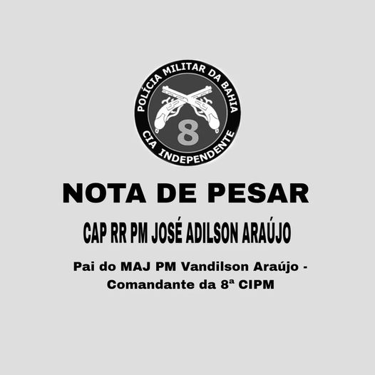 É com profundo pesar que lamentamos o falecimento do CAP RR PM José Adilson Araújo, pai do MAJ PM Vandilson Araújo, Comandante da 8ª CIPM, ocorrido na cidade de Salvador . O sepultamento está previsto amanhã (30/01) às 11h00min no Cemitério Bosque da Paz em Salvador.