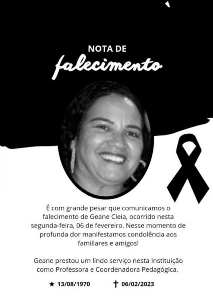 Faleceu nesta segunda (06) aos 52 anos, a professora da APAE (A Associação de Pais e Amigos dos Excepcionais) de Itapetinga, Geane Cléia Ribeiro.