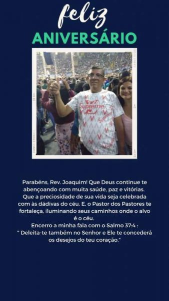 PASTOR JOAQUIM COMPLETA MAIS UM ANO DE VIDA E RECEBE FELICITAÇÕES DA ESPOSA PASTORA RÚBIA, DOS FILHOS JOÁS E JONATAS E DE TODA IGREJA DO EVANGELHO QUADRANGULAR