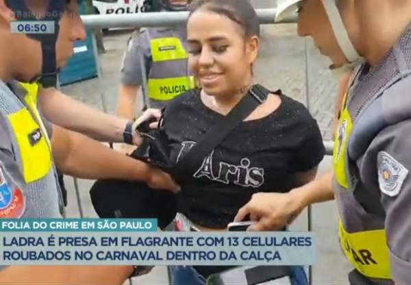 Uma mulher foi presa com 13 celulares escondidos na cintura, em Pinheiros, na zona sul de São Paulo (SP). Aos policiais, ela disse que os aparelhos foram furtados em um bloco de carnaval na região. Na abordagem, Karina dos Santos chegou a debochar da equipe policial e disse que “fizessem seu trabalho” sem agressão, pois já estava detida.
