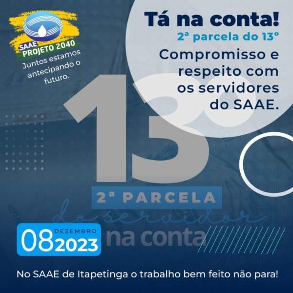 Valorizando os nossos servidores, para que retribuam em trabalho para a nossa população, A Direção do SAAE de Itapetinga autorizou o pagamento antecipado da segunda parcela do 13º salário dos seus servidores, cujo depósito foi feito nesta sexta-feira, 08/12/2023, mesmo a legislação trabalhista dando prazo até o dia 20/12, para o referido pagamento.
