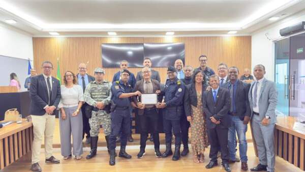 A Moção de Aplauso foi recebida durante a sessão pelo comandante da corporação, Inspetor Márcio Ramos, acompanhado de outros representantes da Guarda Municipal. (Ascom)