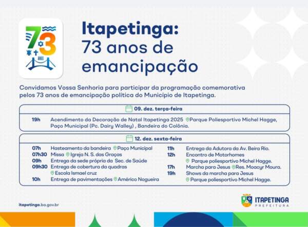 ITAPETINGA:PROGRAMAÇÃO COMEMORATIVA DOS 73 ANOS DE EMANCIPAÇÃO