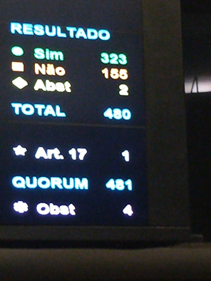 A aprovação se deu com 323 votos favoráveis, 155 contrários e 2 abstenções. Eram necessários ao menos 308 votos a favor para a matéria seguir tramitando. De acordo com o presidente da Câmara,Eduardo Cunha (PMDB-RJ), a votação em segundo turno deverá ocorrer após o recesso parlamentar de julho, já que é preciso cumprir prazo de cinco sessões antes da próxima votação.