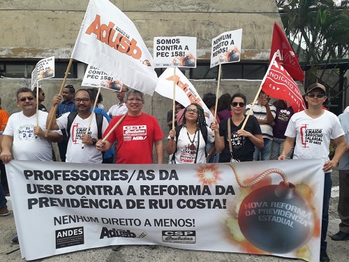 Docentes da Universidade Estadual do Sudoeste (Uesb) mantém as suas atividades paralisadas na última quarta-feira (29), em cumprimento à paralisação de 48h aprovada em assembleia. Em Salvador com a adesão de estudantes, professores e técnicos participam de manifestação contra a PEC 159, da Reforma da Previdência estadual. Os trabalhadores durante a paralisação, docentes das universidades baianas refirmaram a “necessidade de luta pela retirada total da PEC 159 não aceitando a mitigação de danos, pois para quem vai perder a sua aposentadoria depois de tantos anos de trabalho e contribuição, “migalhas” não atenuam a desvalorização de nossa aposentadoria e tampouco cessam os ataques futuros”. Os profissionais não descartam a construção de uma grande greve geral dos servidores públicos estaduais.