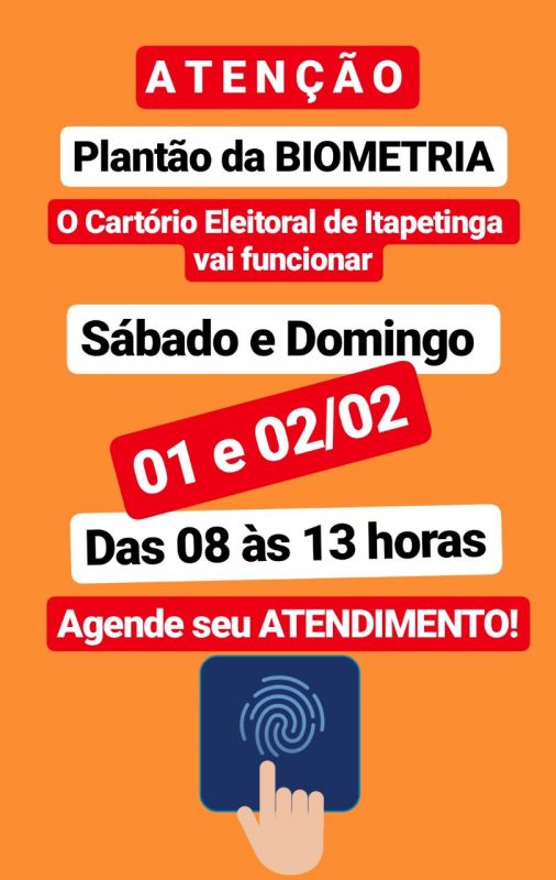 O Cartório Eleitoral de Itapetinga estará de plantão neste final de semana, nos dias 01 e 02 de fevereiro (sábado e domingo), das 08:00 às 13:00hs, onde o eleitor poderá realizar o cadastramento sem fila e sem demora, basta agendar pelos meios disponíveis, portal do TRE-BA, Whatsapp 71-3373-7223, telefone 0800716505…
