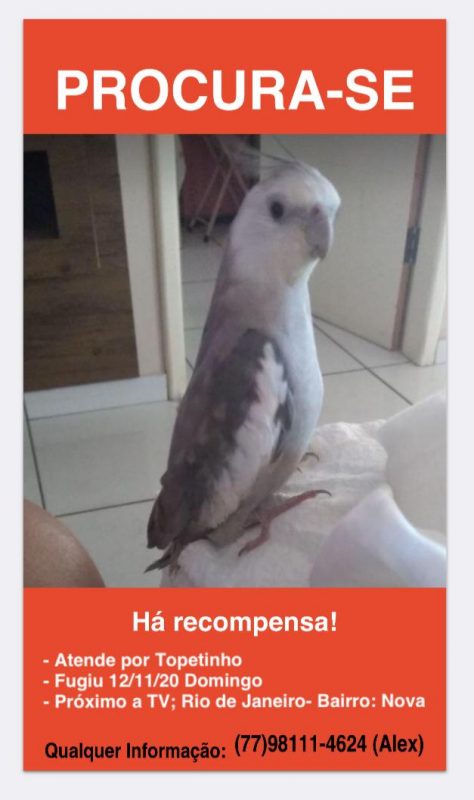 ITAPETINGA: ENCONTRA-SE DESAPARECIDA UMA AVE DA RAÇA CALOPSITA QUE ATENDE PELO NOME DE TOPETINHO. QUEM ENCONTROU OU ENCONTRAR SERÁ BEM GRATIFICADO