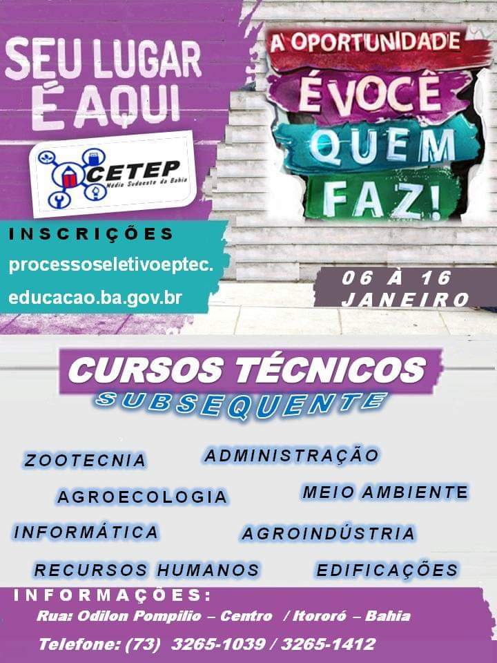 As inscrições para os alunos que quiserem estudar no CETEP – CENTRO TERRITORIAL DE EDUCAÇÃO PROFISSIONAL DO MÉDIO SUDOESTE DA BAHIA – nos Cursos Técnicos Subsequente (para quem já terminou o Ensino Médio) começam na próxima segunda-feira, 06/janeiro e seguem até o dia 16. Os Cursos Técnicos disponíveis são: ZOOTECNIA, ADMINISTRAÇÃO, AGROECOLOGIA, MEIO AMBIENTE, INFORMÁTICA, AGROINDÚSTRIA, RECURSOS HUMANOS E EDIFICAÇÕES…