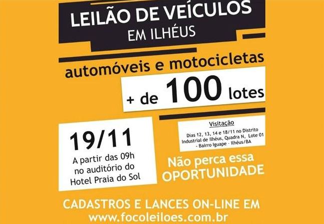 O pregão, o segundo do ano organizado pela Superintendência de Transporte, Trânsito e Mobilidade (Sutram), ocorre nas modalidades on-line e presencial, pelo maior lance. Antes do leilão, foi concedido aos proprietários o direito de ações de regularização. As notificações foram enviadas via e-mails e cartas, além de publicação em um jornal de grande circulação. As visitações acontecem até o próximo dia 18, no Distrito Industrial de Ilhéus, Quadra N, lote 01, no bairro Iguape, zona norte da cidade. Cadastros e lances online no site.
