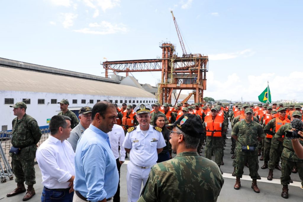 Uma tropa com 260 de fuzileiros navais chegou a Ilhéus nesta quinta-feira, 14, para ageegar esforços junto a centenas de voluntários e representantes de diversos órgãos nas ações de limpeza das praias do litoral sul do estado. Eles desembarcaram no Porto do Malhado e foram recebidos pelo Prefeito do Município, Mário Alexandre.