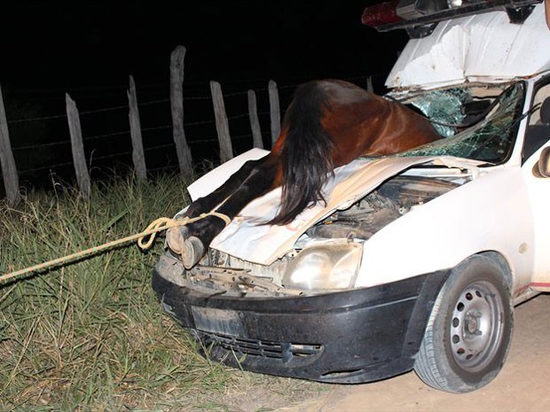 Motorista sobrevive ao atropelar cavalo e animal entrar por para-brisa