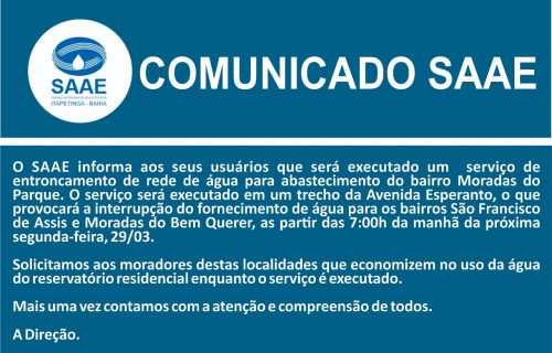 O SAAE informa aos seus usuários que será executado um serviço de entroncamento de rede de água para abastecimento do bairro Moradas do Parque. O serviço será executado em um trecho da Avenida Esperanto, o que provocará a interrupção do fornecimento de água para os bairros São Francisco de Assis e Moradas do Bem Querer, as partir das 7:00h da manhã da próxima segunda-feira, 29/03.