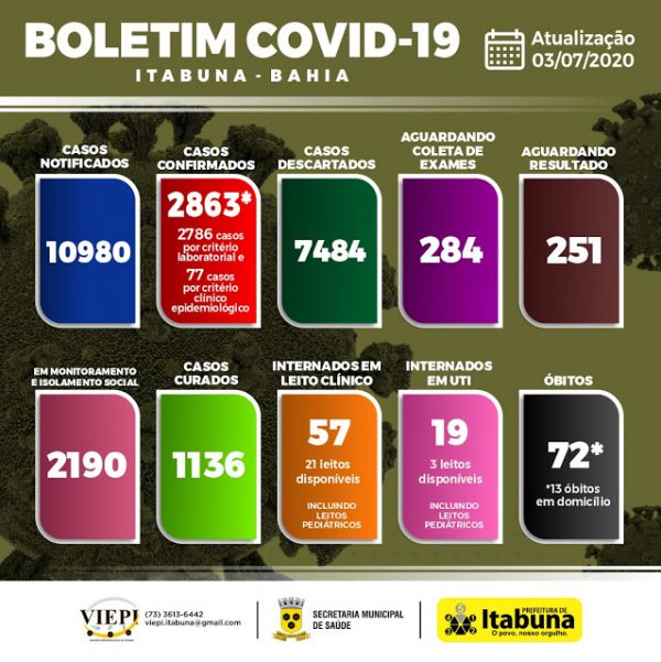 Na noite desta sexta-feira (03), a Vigilância Epidemiológica de Itabuna divulgou um quadro atualizado sobre os casos notificados à respeito da pandemia de infecção pelo coronavírus, causador da doença Covid-19.