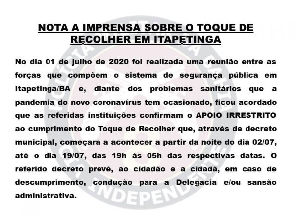 A exceção fica para situações de urgência e emergência, deslocamentos para serviços de saúde e farmácia, além de profissionais de saúde em trabalho. O toque de recolher mais extenso será o de Itapetinga que vai até o dia 19 de julho. Em Itaberaba o decreto se estende até o dia 9 de julho, e em Itabuna, no dia 8 de julho.