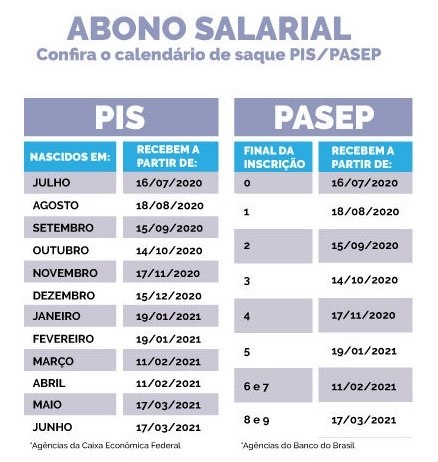 O montante pode ser recebido por trabalhadores da iniciativa privada, vinculados ao PIS (Programa de Integração Social). Já para os funcionários públicos, associados ao Pasep (Programa de Formação do Patrimônio do Servidor Público), o calendário segue o dígito final do número de inscrição no sistema.