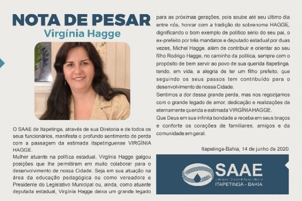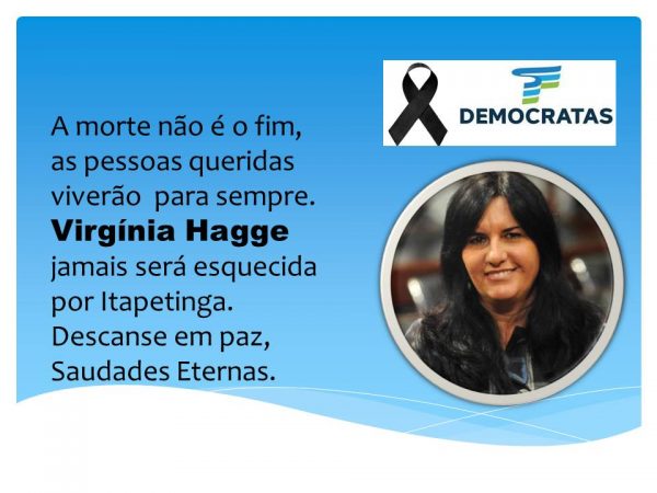 Manifesto o meu profundo pesar pelo falecimento, neste domingo (14), da amiga e ex-deputada estadual, Virgínia Hagge, uma das principais figuras políticas de Itapetinga e região. Portanto, neste momento, externo a minha solidariedade e conforto ao seu pai, Michel Hagge, sua mãe Iracema Hagge, ao seu filho, o prefeito Rodrigo Hagge, aos demais familiares e amigos.